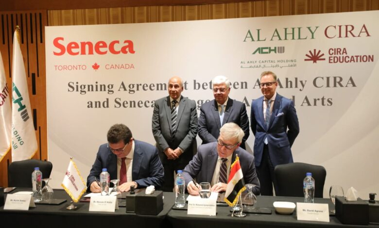 وأعرب الوزير عن سعادته بحضور حفل توقيع مذكرة تفاهم بين شركة الأهلي سيرا للخدمات التعليمية وجامعة سينيكا الكندية التي تعد من أكبر الجامعات في كندا، مشيدًا بهذه الشراكة المميزة التي تنبئ بنجاح كبير، وتستهدف رفع القدرات الأكاديمية والمؤسسية فيما يتعلق بالجودة، والكفاءة، والملاءمة، والارتقاء بمستوى كفاءة وجودة الخريجين، وتمكينهم من المنافسة للحصول على فرص عمل حقيقية في مصر وخارجها، من خلال إنشاء فرعين لجامعة سينيكا بمصر في مجال الفنون التطبيقية والتكنولوجيا، أحدهما في شرق القاهرة والآخر في غربها.