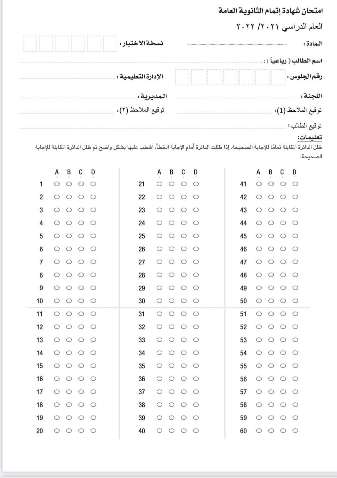 ارفق لحضراتكم نموذجين من البابل شيت أحدهما باللغة العربية والآخر لطلاب مدارس اللغات والاختلاف الوحيد هو استخدام الحروف العربية (ا، ب، ج، د) او اللغة الانجليزية (A, B, C, D) لتمييز الدوائر.