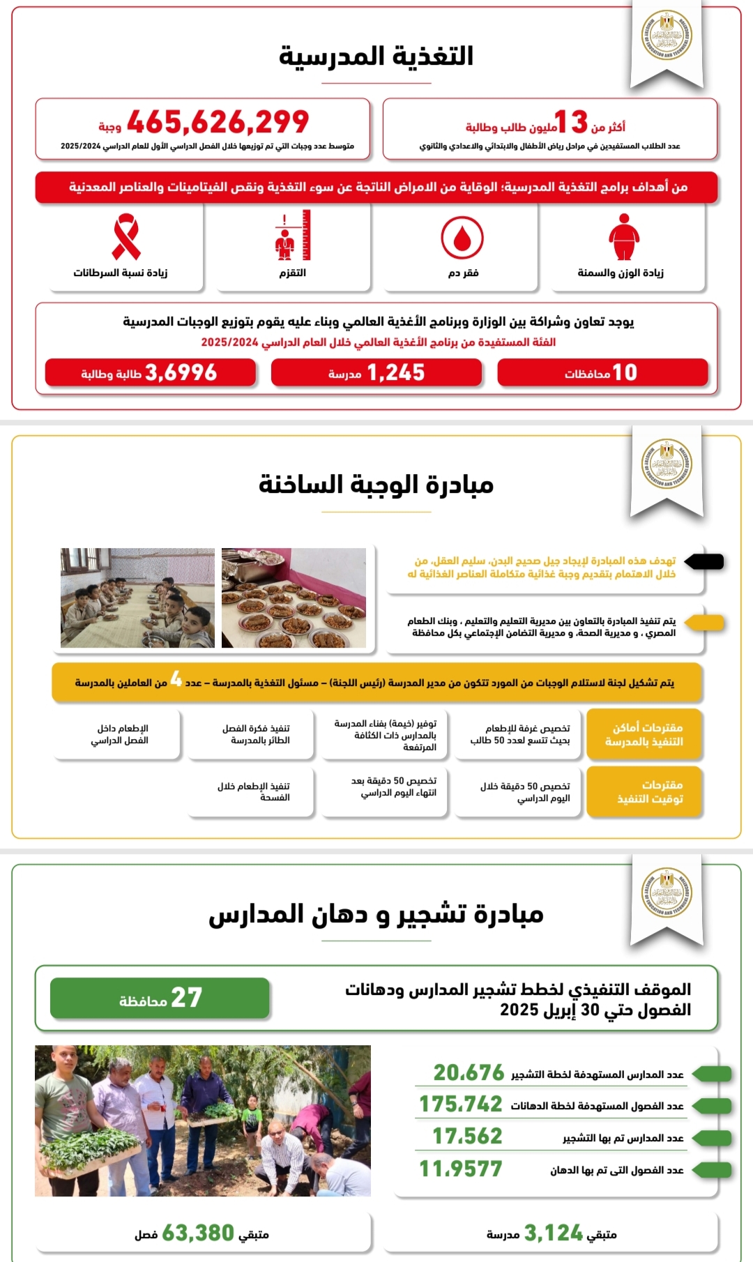 اعلن السيد محمد عبد اللطيف وزير التربيه والتعليم اعداد مبادرة بتعاون وشراكة بين الوزارة وبرنامج الاغذيه العالمى لصرف وجبات ساخنه تصل إلى ٤٦٥مليون و٦٢٦الف و٢٩٩ وجبه ساخنه لأكثر من ١٣ مليون طالب وطالبه .تتكون الوجبه الساخنه من لحوم وكفته وارز ويتم تغذية التلاميذ لمواجهة امراض سؤ التغذيه ومنها زيادة الوزن والسمنه وفقر الدم والتقذم وزيادة نسبة السرطانات .