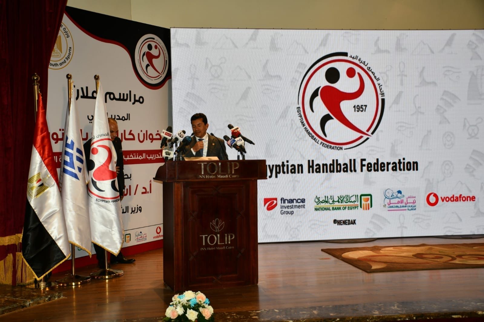 وزير الشباب والرياضة يشهد فعاليات المؤتمر الصحفي للإعلان الرسمي عن الجهاز الفني للمنتخب الوطني لليد برئاسة الاسباني خوان كارلوس باستور