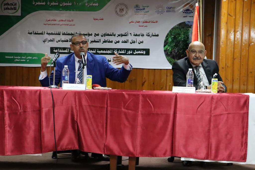 شاركت جامعة 6 أكتوبر بالتعاون مع مؤسسة هنجملها للتنمية المستدامة من أجل الحد من مخاطر التغير المناخي والاحتباس الحراري، في إطلاق مبادرة مجتمعية لمجابهة التغيرات المناخية، وذلك خلال ندوة بالجامعة حضرها العديد من أعضاء هيئة التدريس والطلاب، تحت رعاية الدكتور جمال سامي رئيس جامعة 6 أكتوبر، والدكتور هشام تمراز نائب رئيس الجامعة لشئون خدمة المجتمع وتنمية البيئة، وبحضور المهندس محمد القبطان.